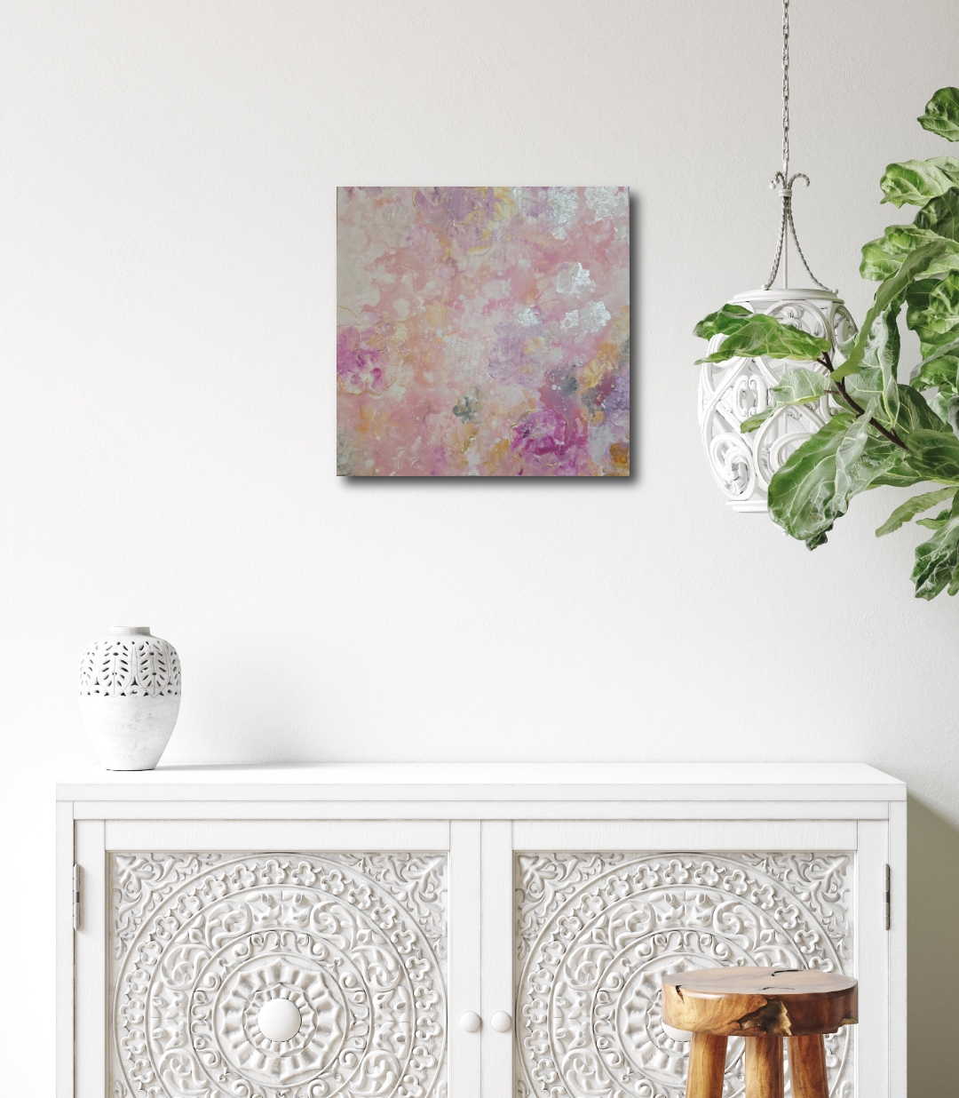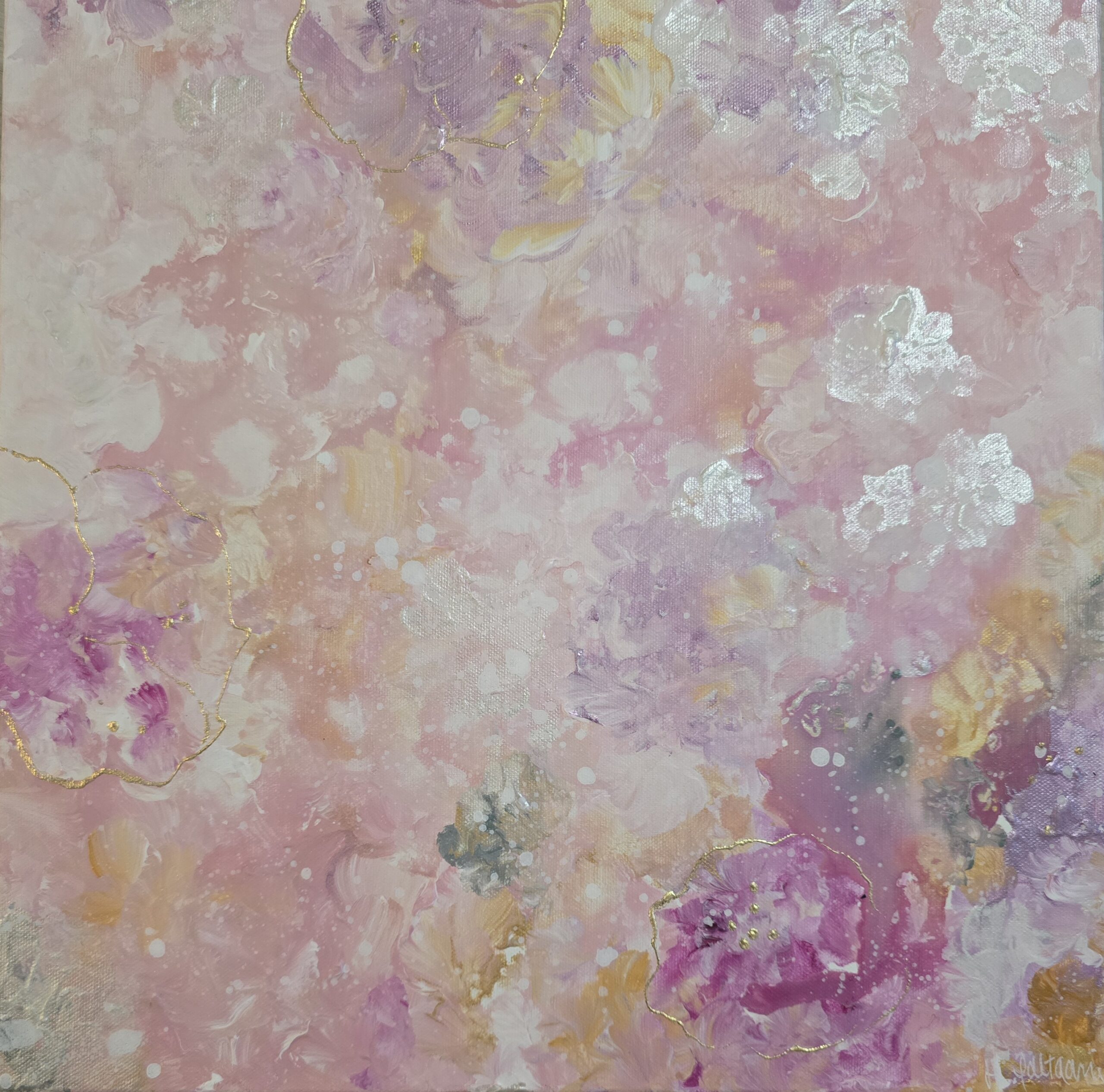 Pieni, herkkä kukkaisaiheinen maalaus. Mitat 40x40x4 cm.