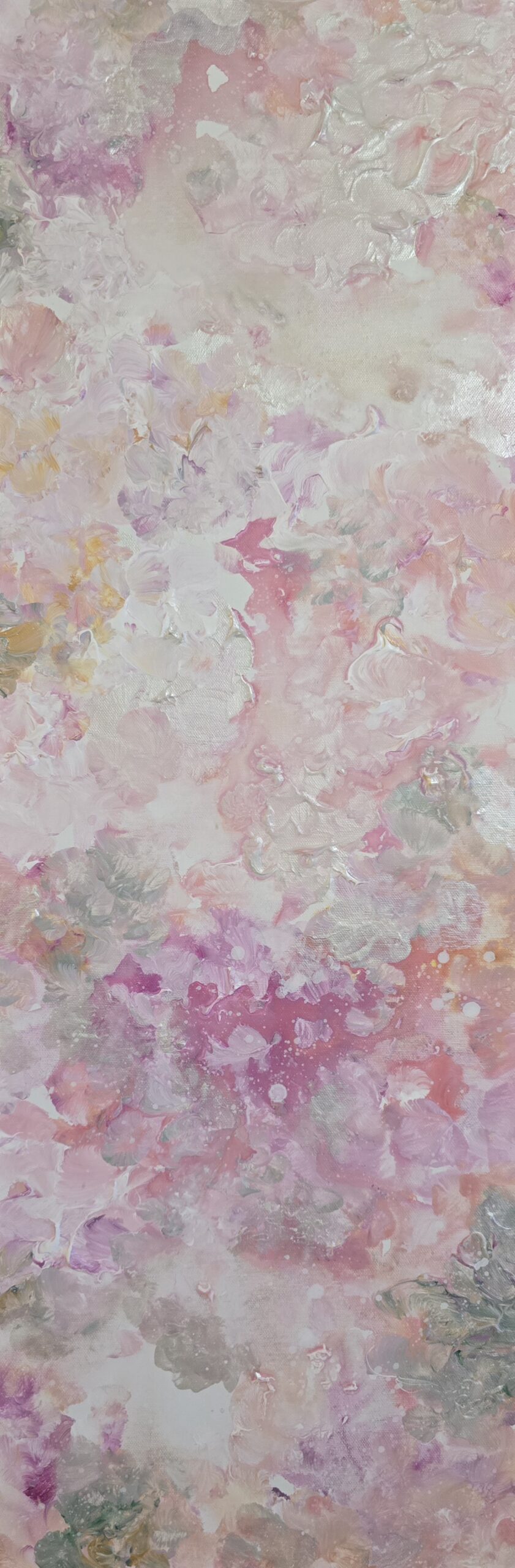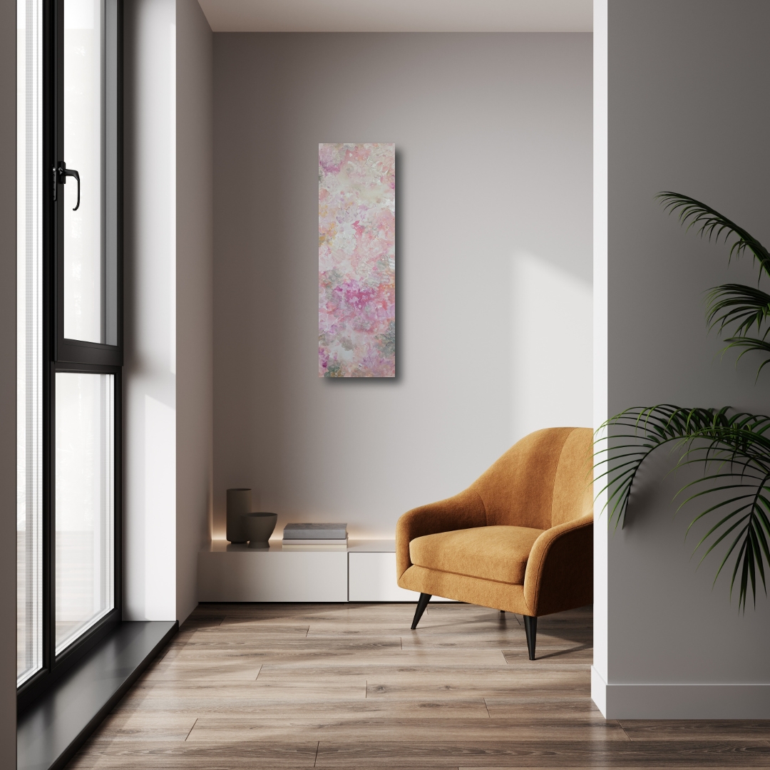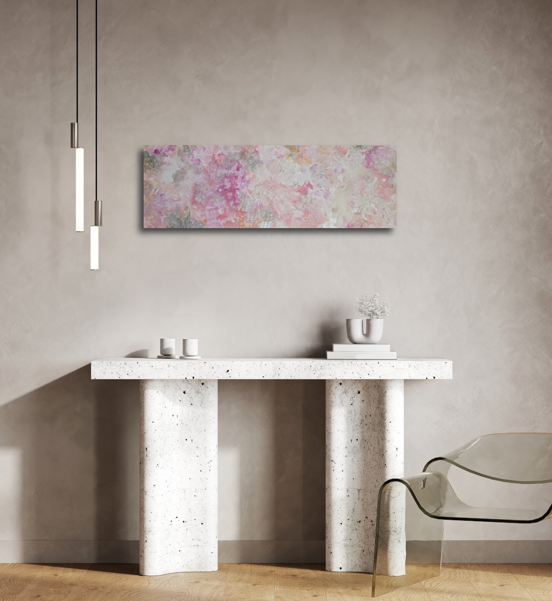 Herkkä, kukkaisaiheinen maalaus. Mitat 30x90x4 cm. Voidaan ripustaa pystyyn tai vaakaan.